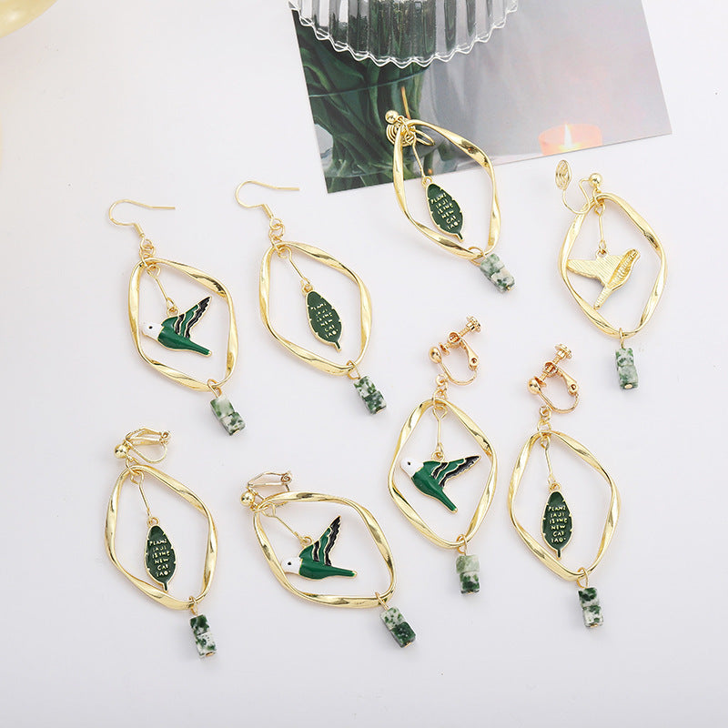 Vintage Green Bird Leaf Earrings – Retro Mori Style Geometric Ear Clips for Women